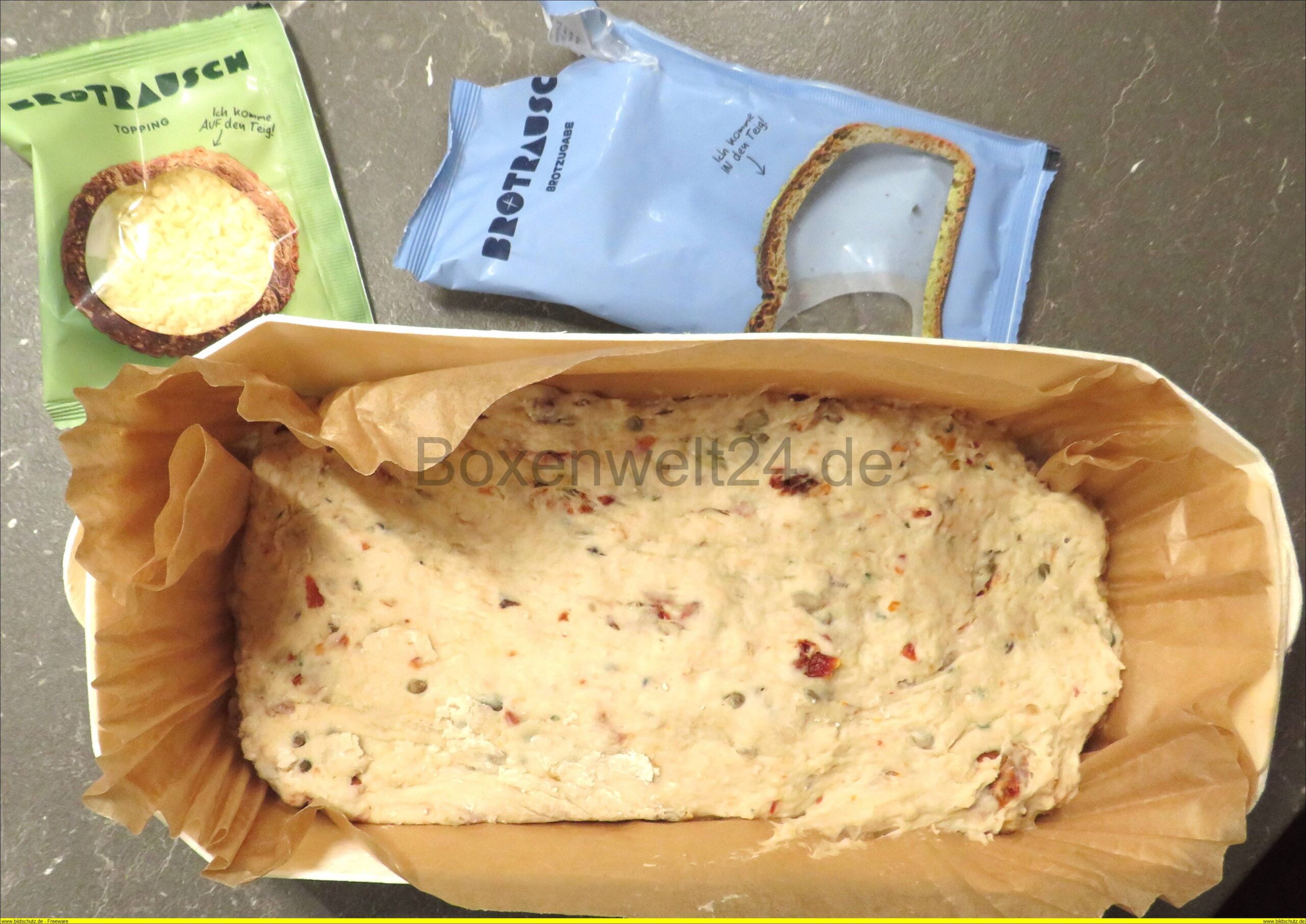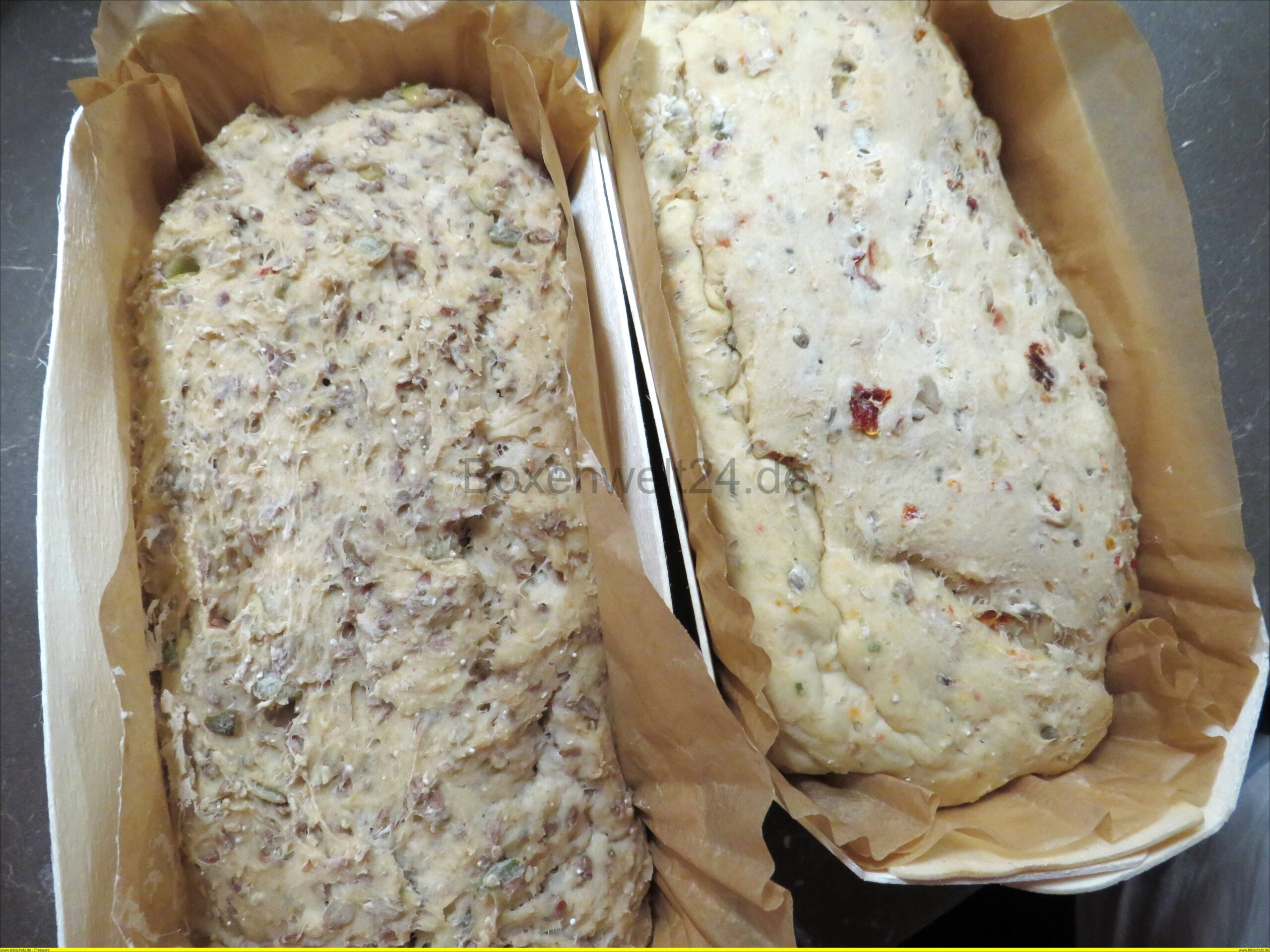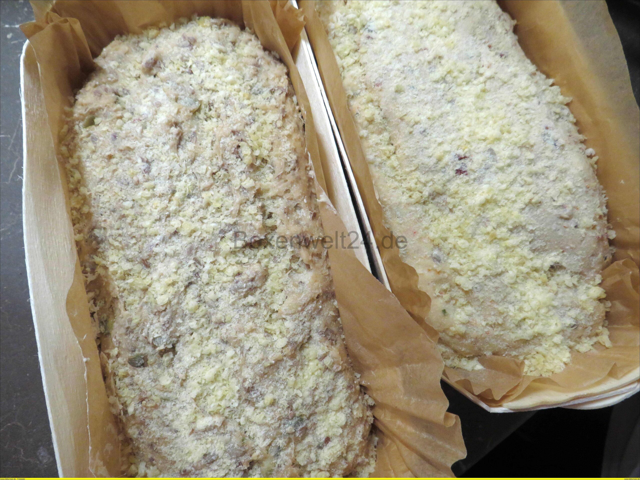 Der Teig wird dann in die Backschale gefüllt, nun hat man die Möglichkeit einer langen oder kurzen Gärzeit. Hier sieht man das Brot davor….
