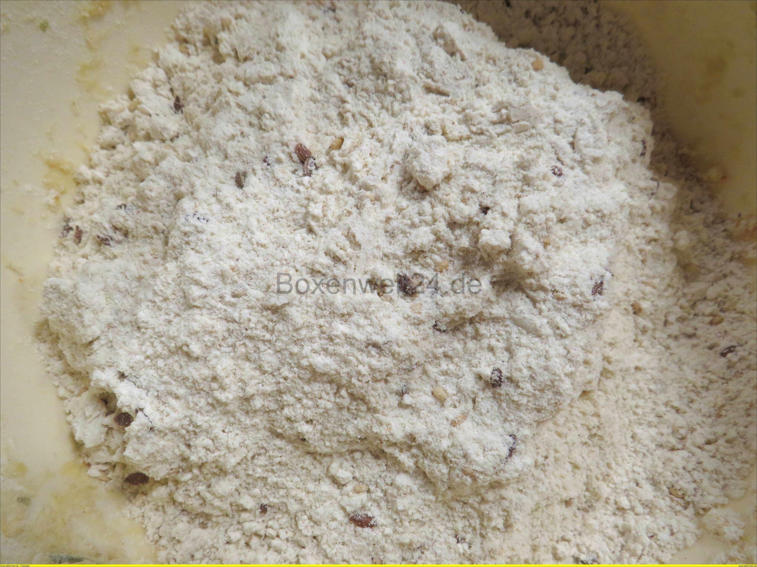 Gestartet habe ich mit dem hellen Landbrot. In den Teig kommt nur etwas Wasser und die Brotzugabe, dann einfach durchmengen.